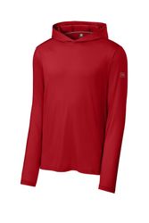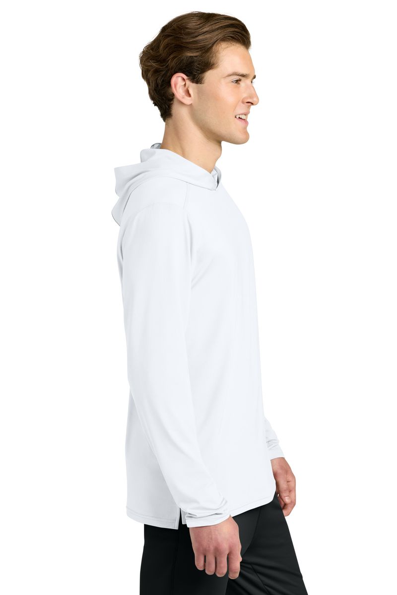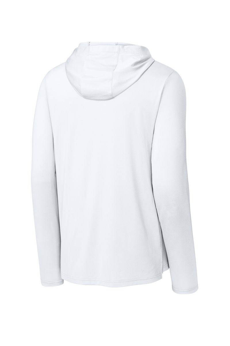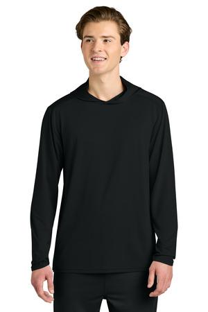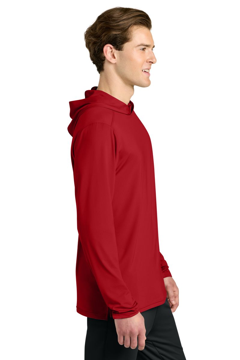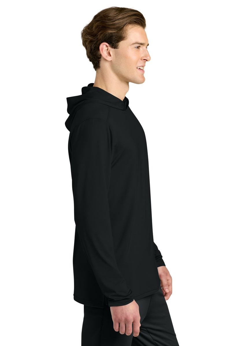 This breathable long sleeve hoodie tee, constructed with a lightweight polyester/spandex performance fabric, offers moisture wicking and odor fighting, along with color-locking technology to keep logos sharp.
