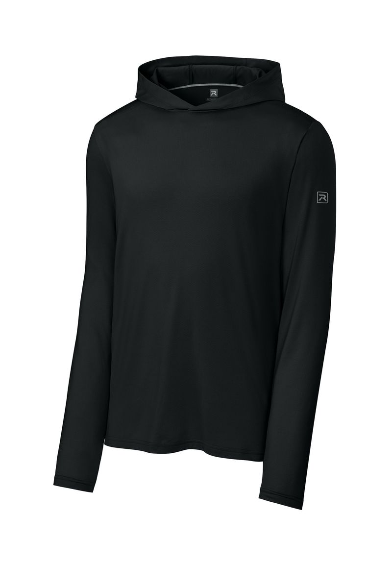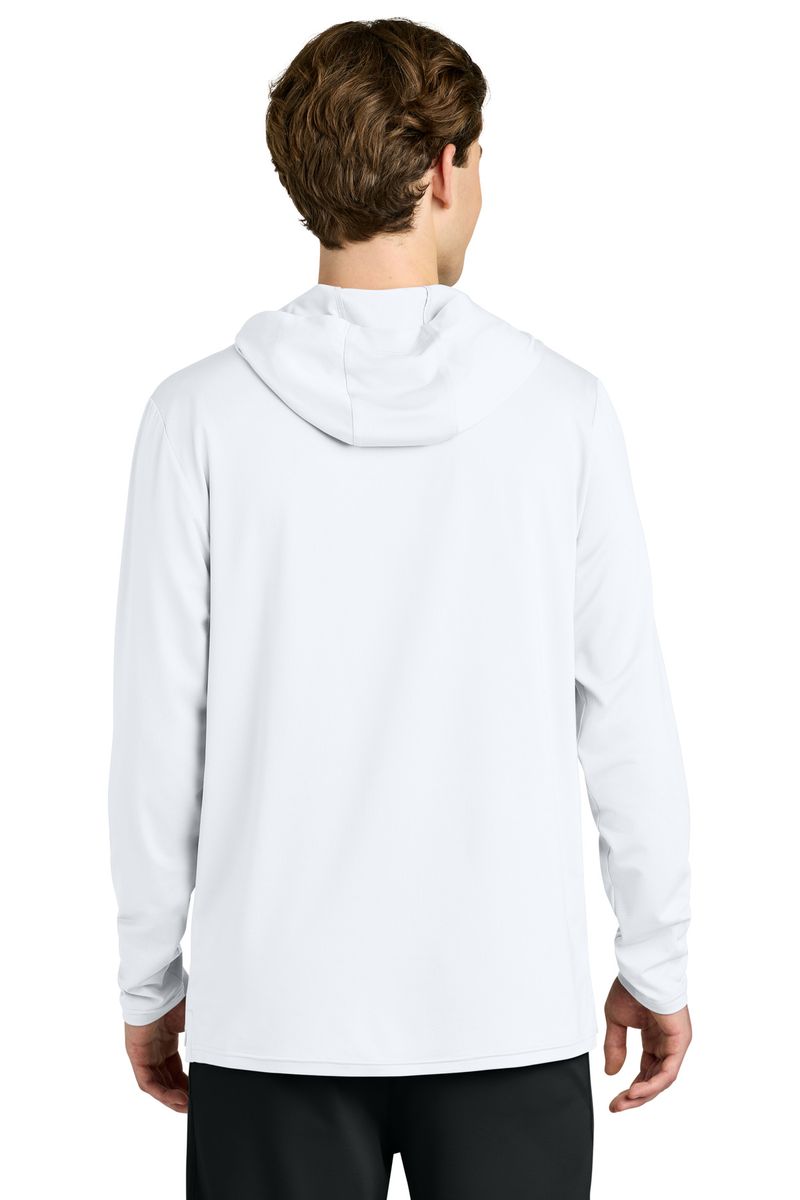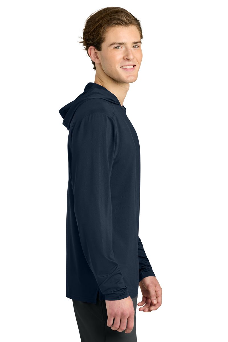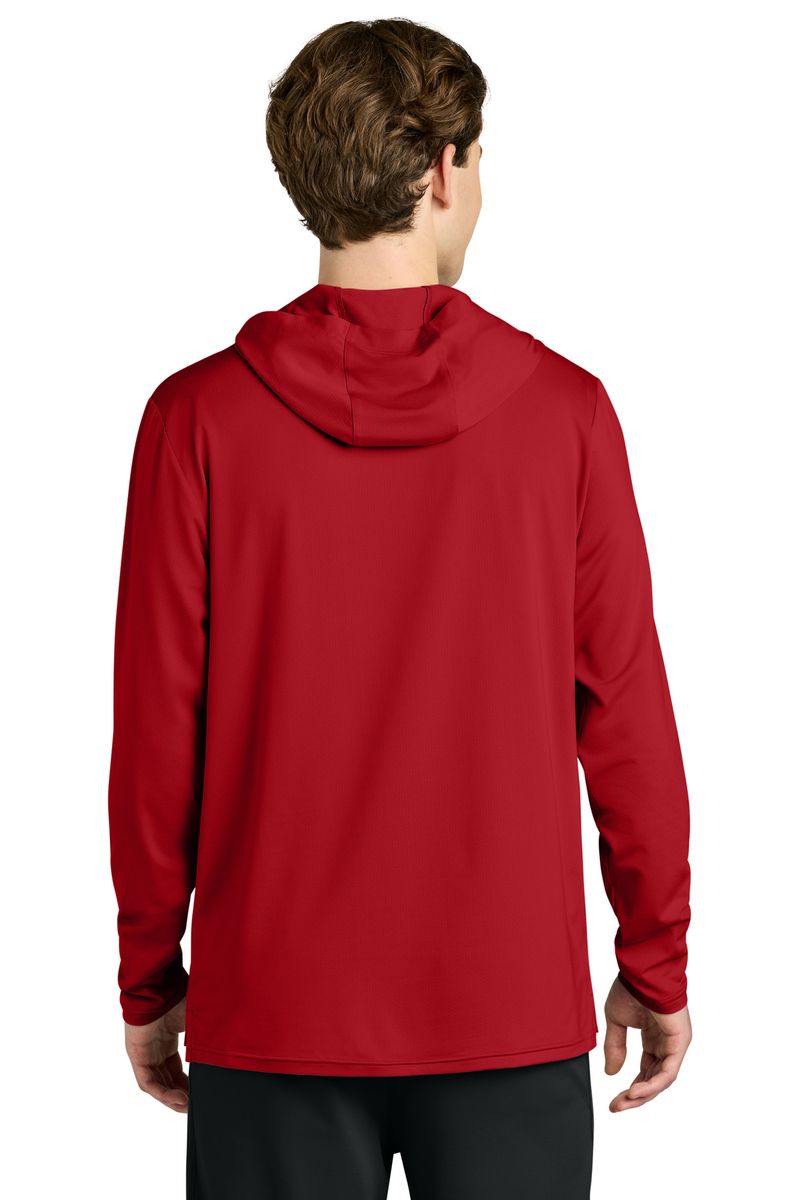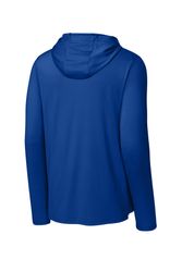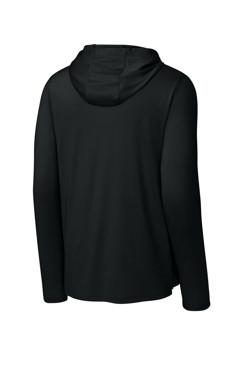 This breathable long sleeve hoodie tee, constructed with a lightweight polyester/spandex performance fabric, offers moisture wicking and odor fighting, along with color-locking technology to keep logos sharp.